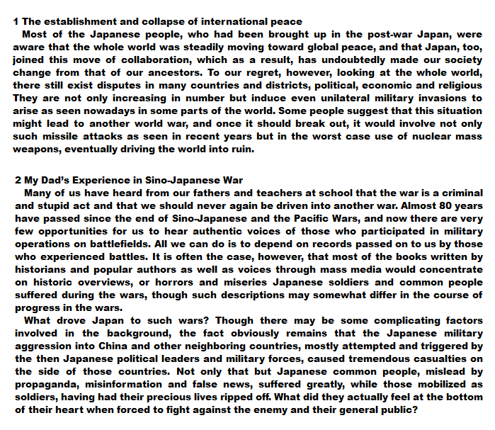 Many of us, who were brought up in the post-war Japan, have heard from our fathers and teachers at school that the war is a criminal and stupid act and that we should never be driven into another war. We believed that the whole world was steadily moving toward a global peace, and that Japan, too, reflecting on her past folly, joined this move of collaboration, which as a result, has made our society newly change from that of our ancestors. To our regret, however, looking at the existing world as a whole, there still exist disputes political, economic and religious in many countries and districts, which are not only increasing in number but even inducing unilateral military invasions to arise as seen nowadays in some parts of the world. Most of the records, books and voices around us in post-war Japan have consistently tended to concentrate on historic overviews, horrors and miseries caused by wars, or how to stop or avoid such. To our regret, nevertheless, does still remain the difficult problem how to achieve the genuine global peace unsolved in our societies.