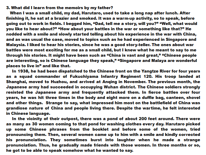 In 1938, Harutaro was dispatched to the Chinese front on the Yangtze River for four years as a squad commander of Fukuchiyama Infantry Regiment 120. His troop landed at Shanghai, moved to Huzhou, and arrived at Anqing in November. The previous month, the Japanese army had succeeded in occupying Wuhan district. The Chinese soldiers strongly resisted the Japanese army and frequently attacked them. In fierce battles over four years, he was hit three times in the body and eight more on a duffle bag, canteen, shovel and other things. Strange to say, what impressed him most on the battlefield of China was grandiose nature of China and people living there. Despite the wartime, he felt interested in Chinese language.
