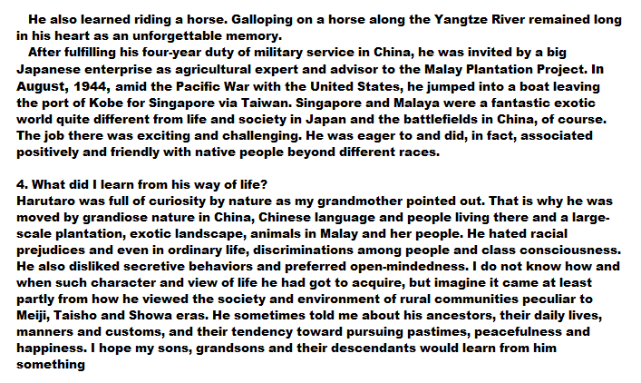 Harutaro, who grew up in the countryside, was, by nature, full of curiosity as my grandmother had pointed out. That seems to be why he was, even amid the war, moved by grandiose nature in China, Chinese language and people living there and a large-scale plantation, exotic landscape, animals in Malay and her people. He hated, even in his ordinary life, such things as racial prejudices, discriminations among people and class consciousness. He also disliked secretive behaviors and preferred open-mindedness. I am not confident enough how and when such character and view of life were nurtured in him, but imagine it came at least partly from his born-nature and the circumstances in which he had been brought up. I hope my sons, grandsons and our descendants would learn from him something worthwhile so as to live their own lives with bravery and happiness.